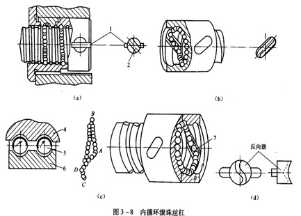 如圖3-7(a)所示是端蓋式,在螺母上加工出一縱向孔,作為滾珠的回程通道,螺母兩端的蓋板上開有滾珠的回程口,滾珠由此進入回程管,形成循環。