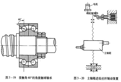 如圖3-20所示為數(shù)控臥式鏜床主軸箱進(jìn)給絲桿制動(dòng)示意圖。制動(dòng)裝置的工作過(guò)程:機(jī)床工作時(shí),電磁鐵通電,使摩擦離合器脫開(kāi)。運(yùn)動(dòng)由步進(jìn)電動(dòng)機(jī)經(jīng)減速齒輪傳給絲杠,使主軸箱上下移動(dòng)。當(dāng)加工完畢,或中間停車時(shí),步進(jìn)電動(dòng)機(jī)和電磁鐵同時(shí)斷電,借壓力彈簧作用合上摩擦離合器,使絲杠不能傳動(dòng),主軸箱便不會(huì)下落。