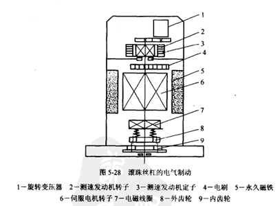 位于垂直位置的滾珠絲杠的制動方式,目前常見的有機械式和電氣式兩種。電氣方式制動是采用電磁制動器,而且這種制動器就做在電機內部。圖5.28所示為FANUC公司伺服電機帶制動器的示意圖。機床工作時,在制動器線圈7電磁力的作用下,彈簧受壓縮,齒輪8與內齒輪9脫開,當停機或停電時,電磁鐵失電,在彈簧恢復力作用下,齒輪8、9嚙合,齒輪9與電機端蓋為一體,因此與電機軸連接的絲杠得到制動,這種電磁制動器裝在電機殼內,與電機形成一體化的結構。
